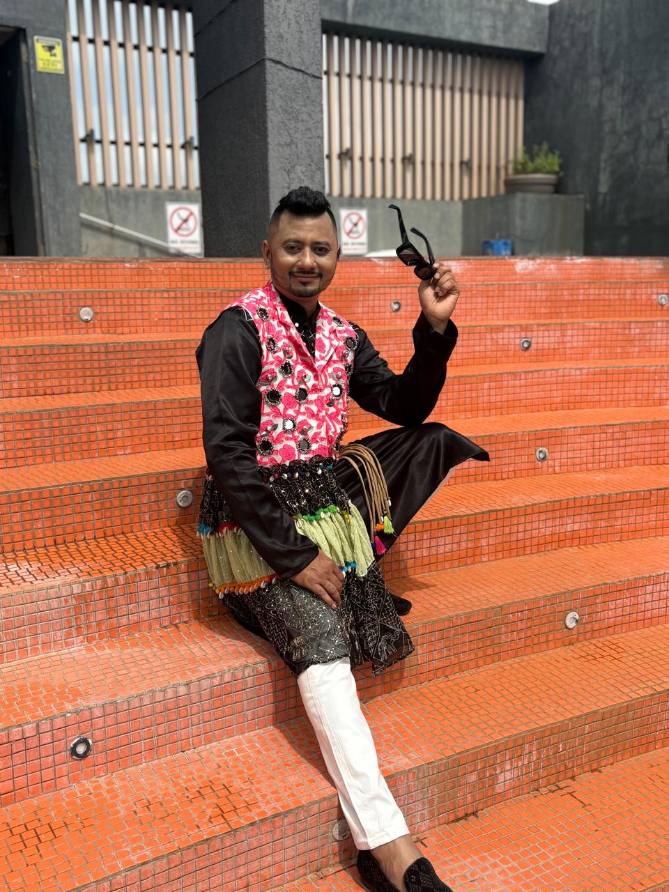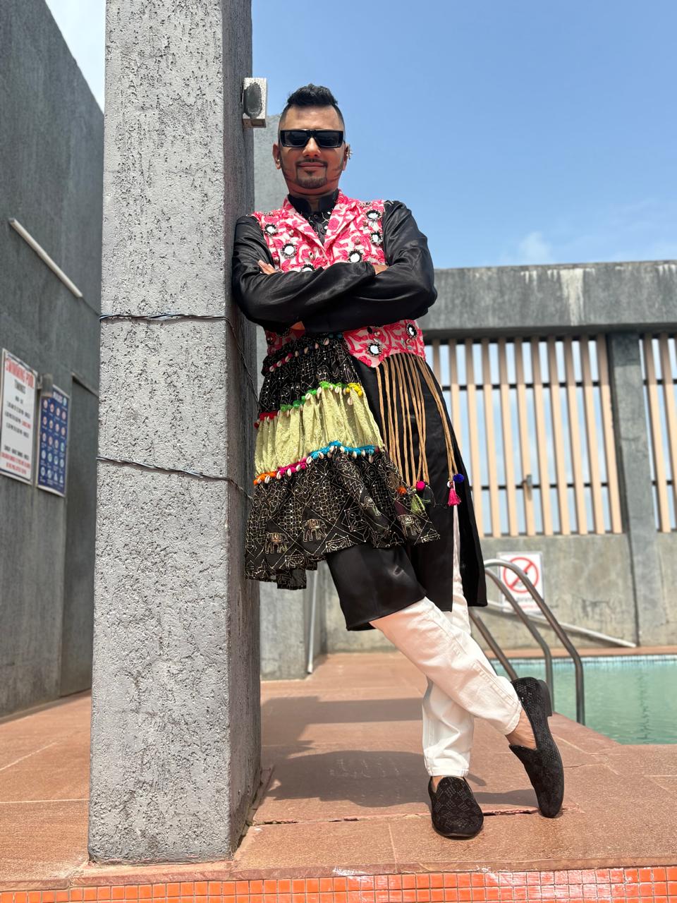 Celebrate this Navratri in style with Raina Fashion’s exclusive men’s festive wear. The outfit features a classic black kurta with white churidar pants, paired with a vibrant embroidered pink jacket. The jacket is enhanced with colorful tassels, mirror work, and intricate patterns, making it a perfect choice for Garba and Dandiya nights.